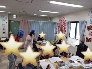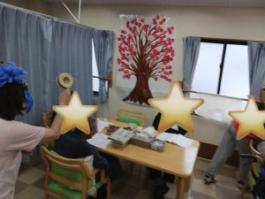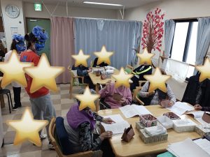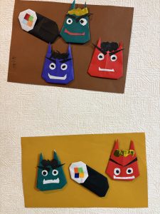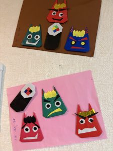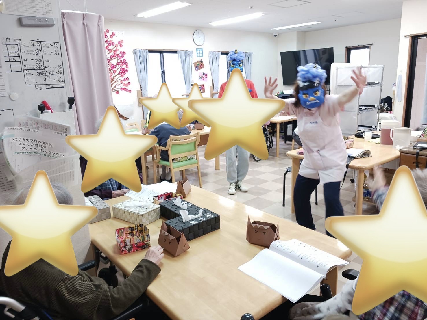 2026.2.3 今年の作戦!いつものように音楽レクリエーションの終盤にまさかの鬼 青鬼登場~de驚かせちゃいました 可愛い鬼型の豆入れ完成 以前は本物の豆を撒いてましたが、ここ数年コロナ騒動明け位から疑似豆です 今年は緑色と茶色の折り紙でちょっぴり大きな豆を作りました さて今年の青鬼は誰でしょう? 毎月の書道を活かして壁貼飾りにご利用者様が「節分」「せつぶん」の文字を書いて下さいました(素晴らしい)
